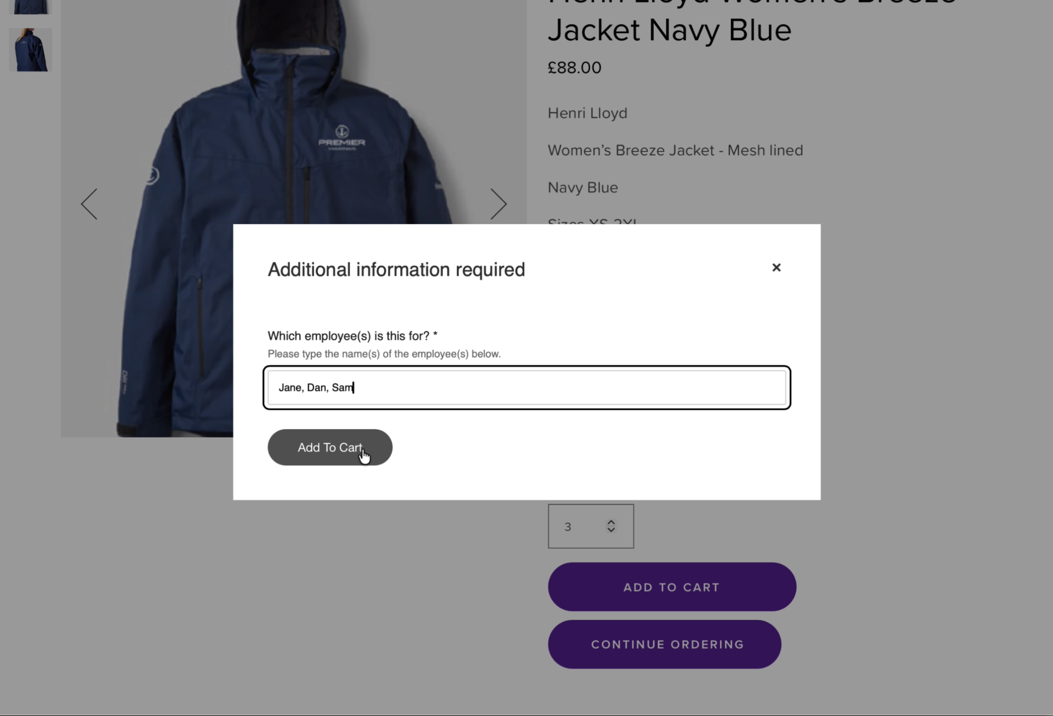 Cart: Click Add to Cart once details are entered. You can access your current selections via the cart icon in the bottom right corner or select the button below to "continue ordering".